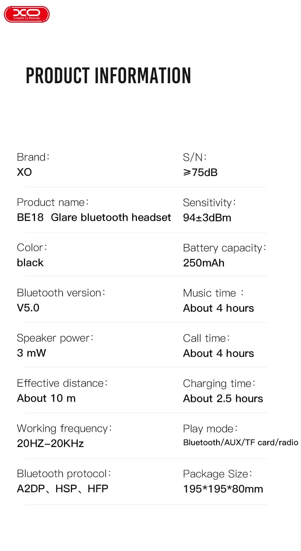 استمتع بتجربة جيدة للاستماع الى الموسيقى مع XO Headset ديناميكي سماعة بلوتوث اللاسلكية و المجهزة بتقنيات متطورة للغاية. حيث تدعم هذه السماعات تقنية البلوتوث 4.1 و هي تمتلك وقت تشغيل طويل تصل إلى ٦ ساعات استخدام متواصل بالشحنة الوحده.